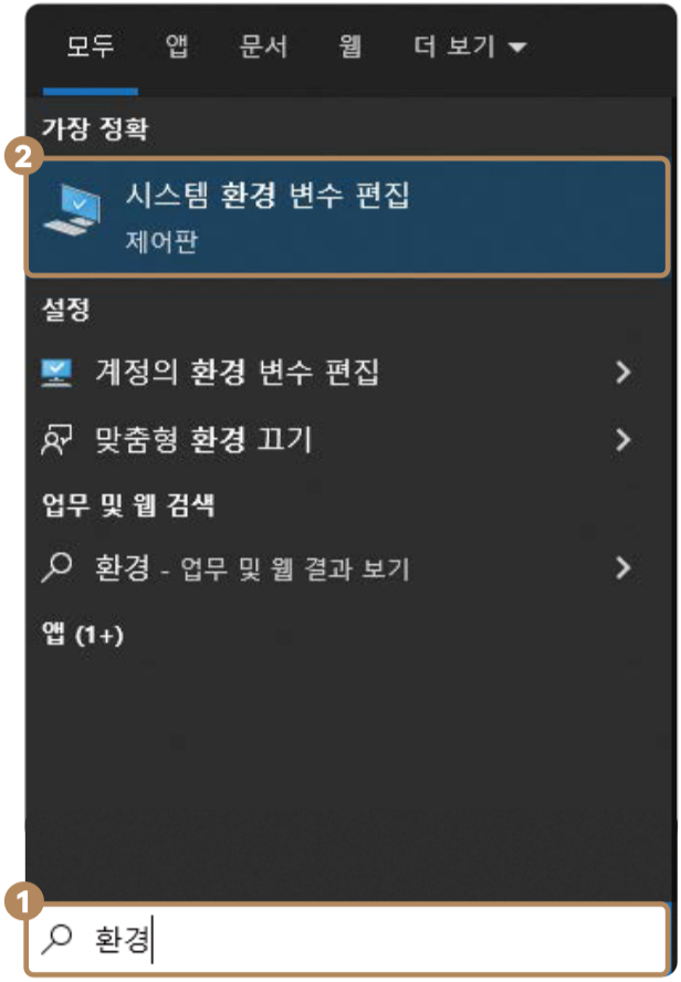 <mark style="color:blue;">01.</mark> 윈도우 검색창에 '환경' 이라고 검색하고 '시스템 환경 변수 편집' 을 클릭합니다.