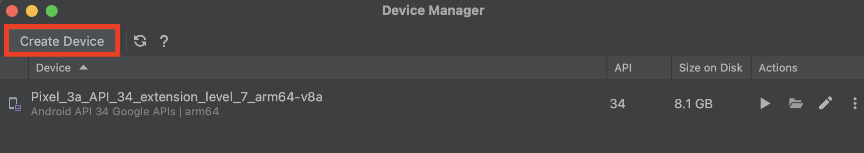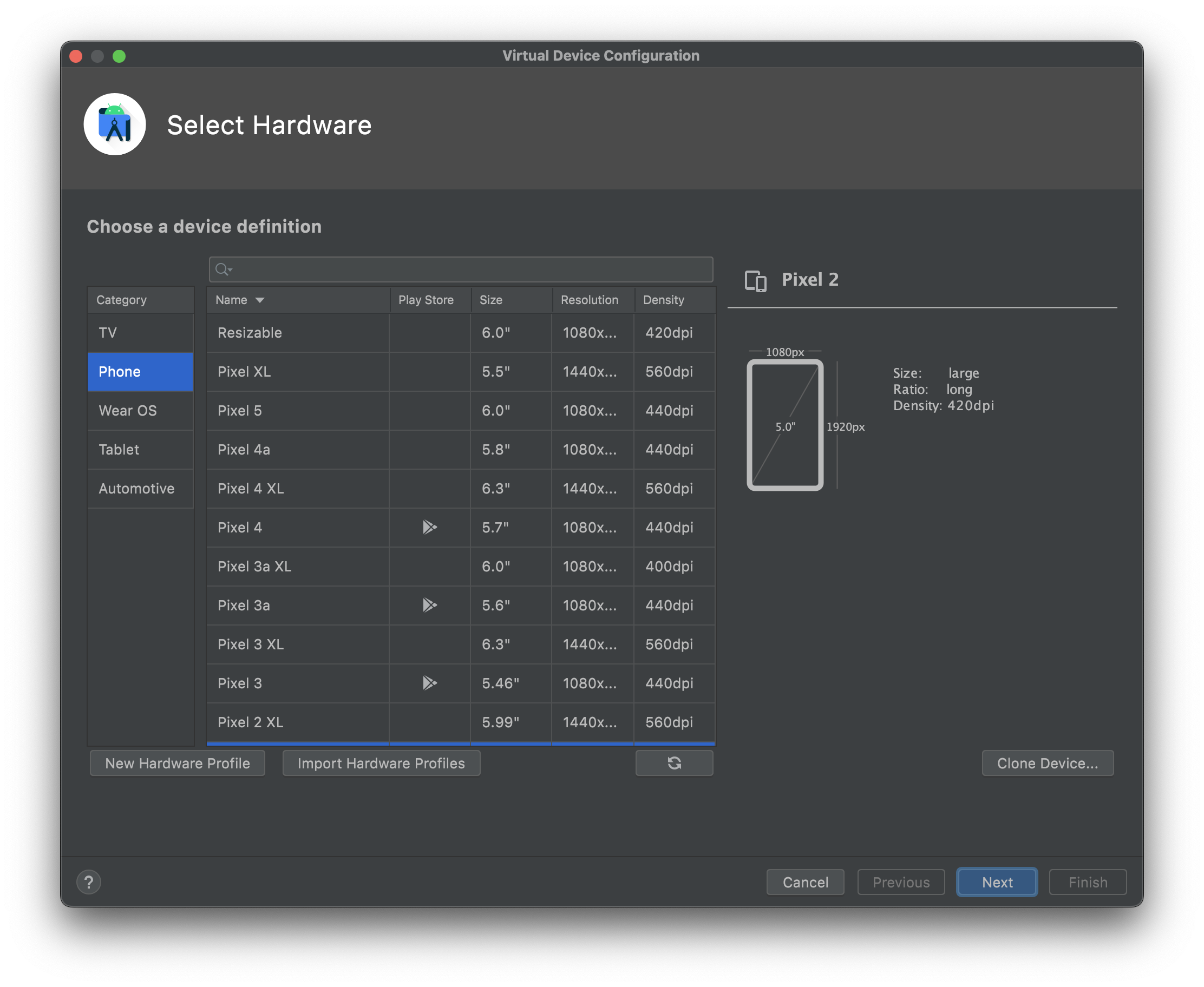 <mark style="color:blue;">07.</mark> \[Create Device]를 통해 원하는 emulator의 해상도와 사양을 설정하고 생성합니다.