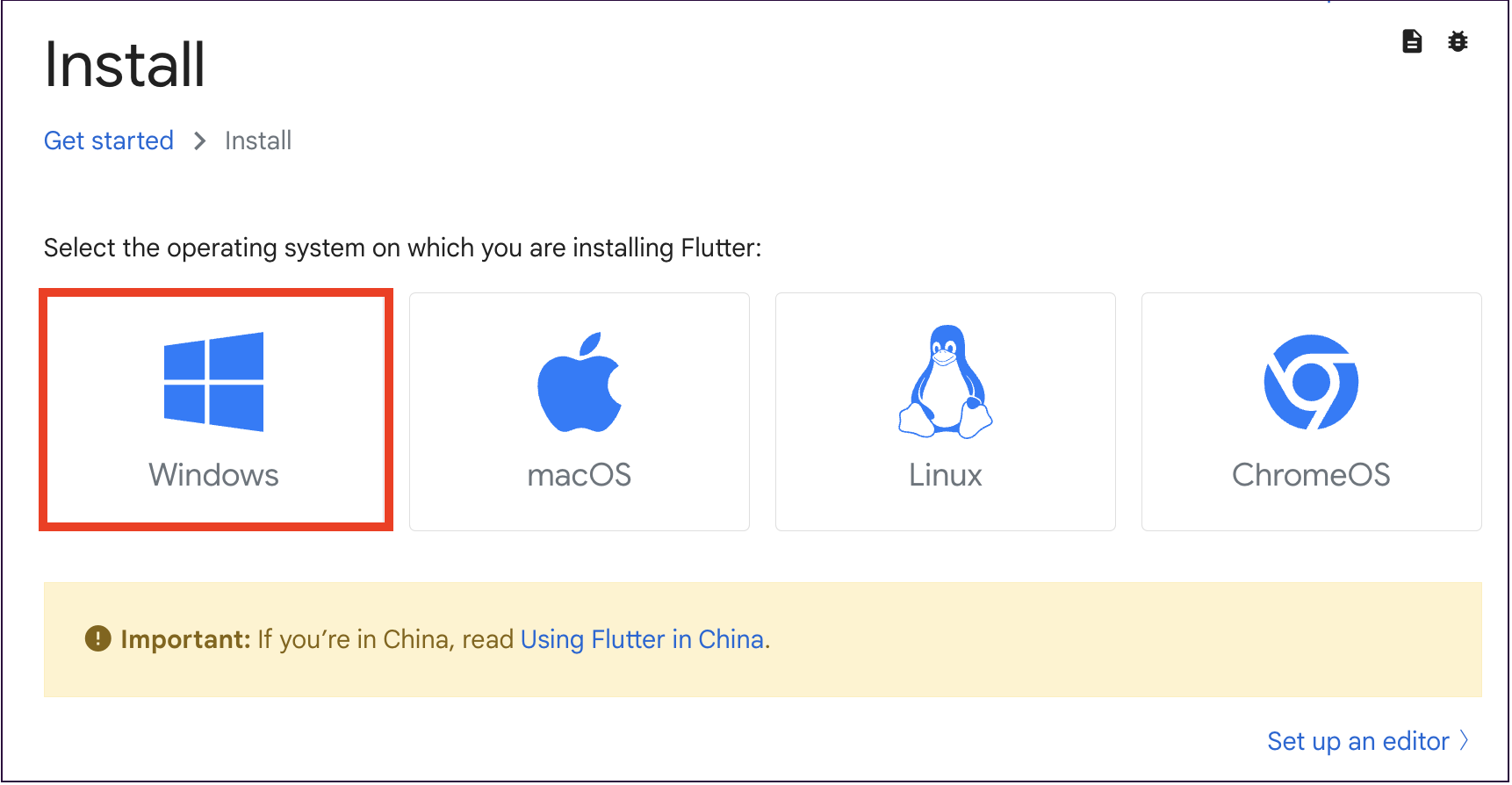 <mark style="color:blue;">01.</mark> 플러터 공식 페이지 <https://docs.flutter.dev/get-started/install> 로 이동합니다.\ <mark style="color:blue;">02.</mark> Windows 버튼을 클릭합니다.
