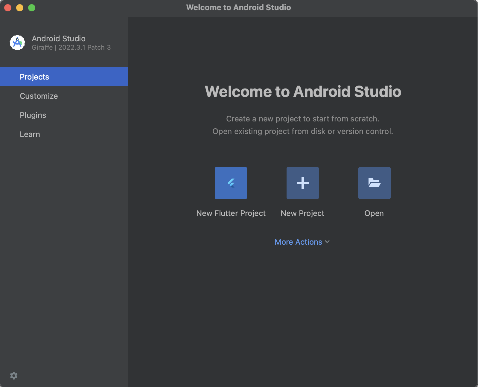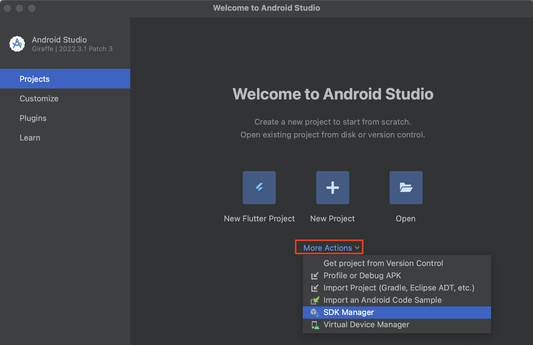 <mark style="color:blue;">04.</mark> Android Studio 메인으로 돌아와 \[More Actions] → \[SDK Manager]를 클릭합니다.
