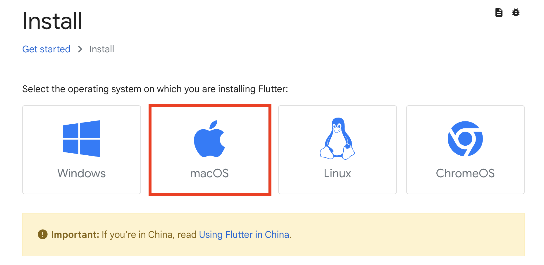 <mark style="color:blue;">01.</mark> 플러터 공식 페이지 <https://docs.flutter.dev/get-started/install> 로 이동합니다.\ <mark style="color:blue;">02.</mark> macOS 버튼을 클릭합니다.