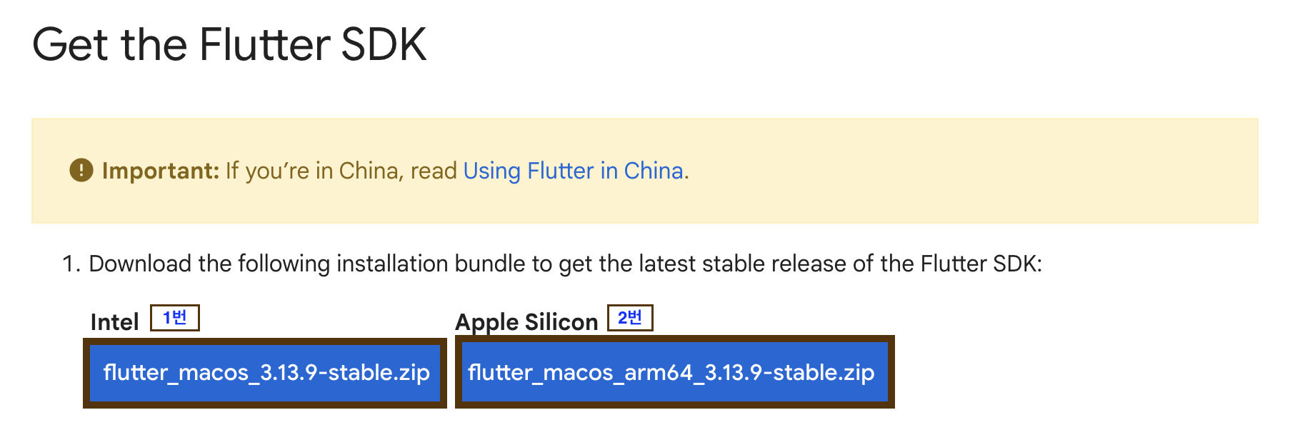 <mark style="color:blue;">03.</mark> 'Get the Flutter SDK'로 이동하면 두 가지 SDK가 보입니다. 인텔 기반 CPU를 장착한 맥이라면 첫번째를, M1 등 M으로 시작하는 계열의 CPU를 장착한 맥이라면 두번째를 클릭해 내려받습니다.&#x20;