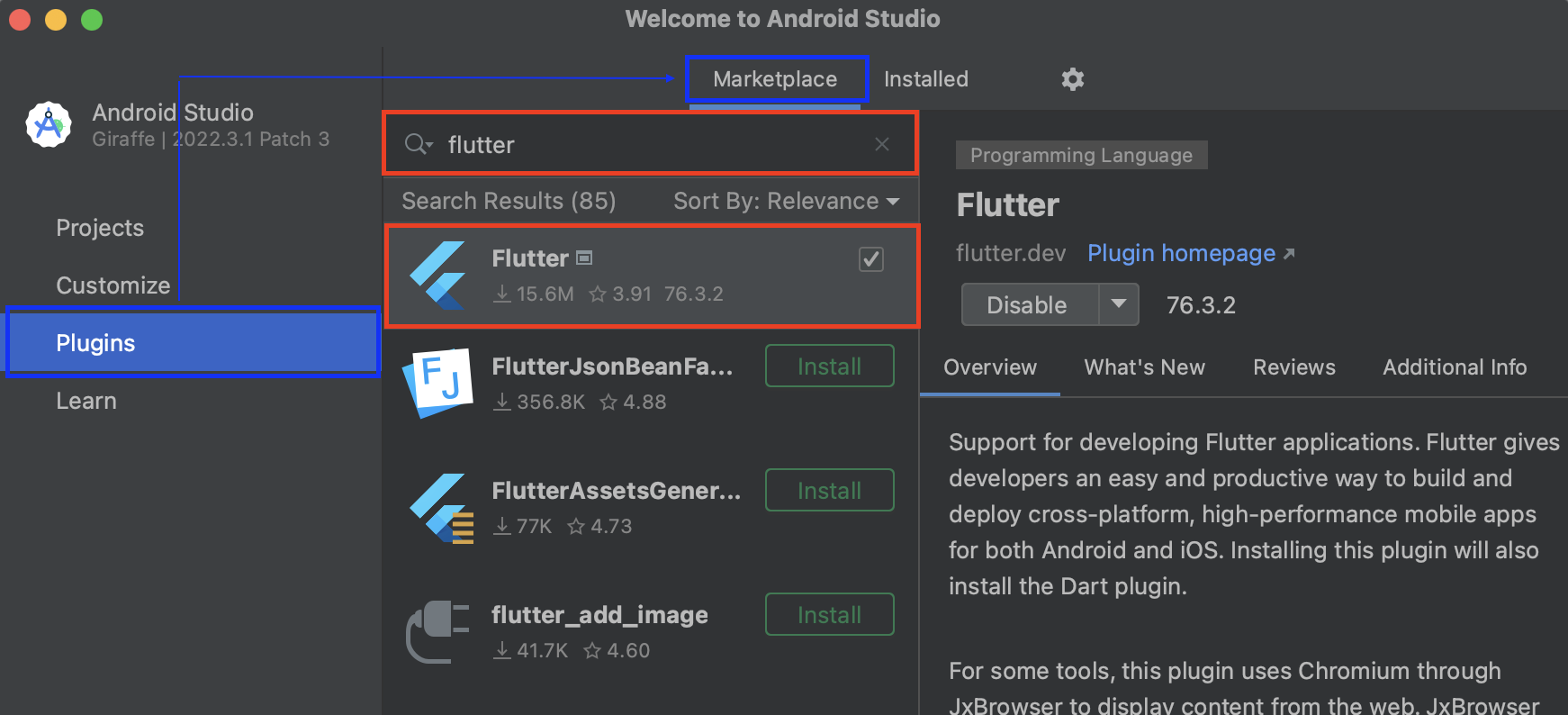 <mark style="color:blue;">02.</mark> 왼쪽 \[Plugins] 버튼 클릭 → \[Marketplace] 탭 → 검색창에 Flutter를 검색합니다. 검색된 플러터 플러그인의 \[Install] 버튼을 눌러서 플러터 플러그인을 설치합니다.&#x20;