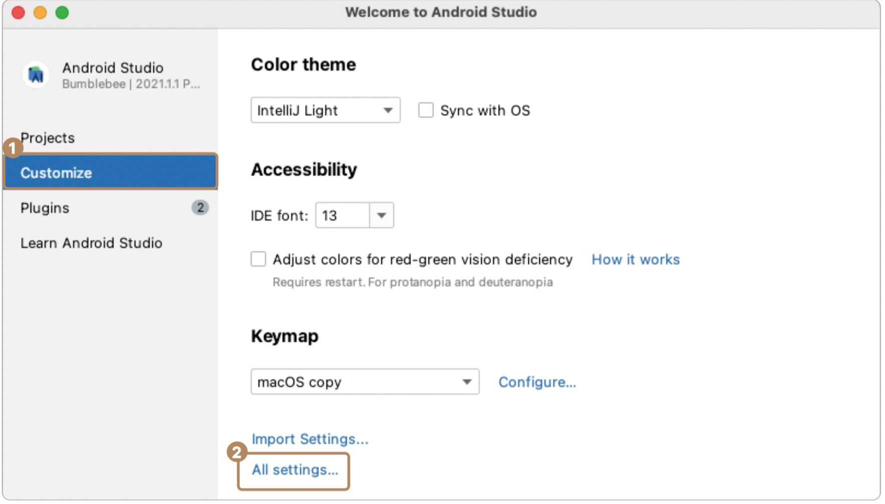 <mark style="color:blue;">01.</mark> \[Customize] -> \[All settings...] 를 클릭합니다