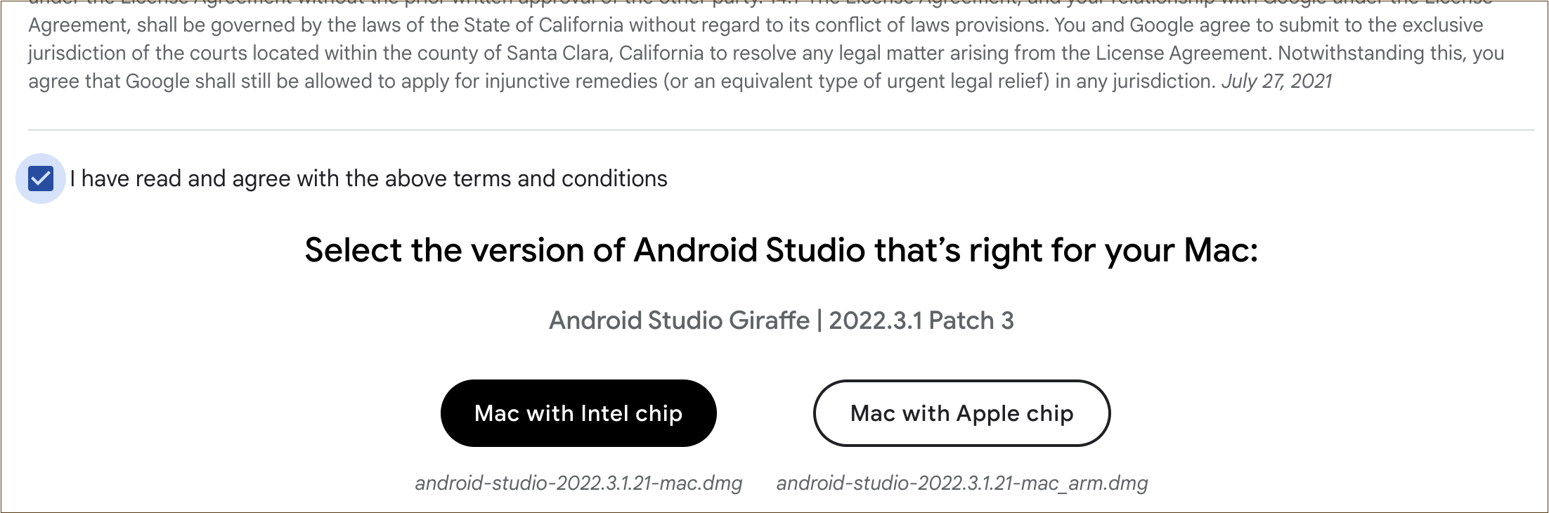 을 눌러 하드웨어에 최적화된 버전의 안드로이드 스튜디오를 다운받습니다.&#x20;
